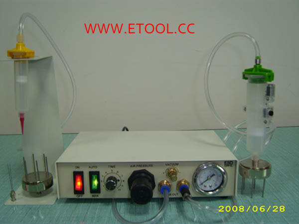 产品详细说明: ET-984A型点胶机是为了适应要求点不同形状的点胶形状而设计的,可同时点多个不同形状的点。 本机是一种同一控制电路同时控制两个点胶针筒的多头同步点胶机,由一个脚踏开关控制起动,只要保持气压稳定,时间长短相同,滴出的液料滴量大小一样。 用户可以使用两个中的任意一个,适用于多点同时灌注。真空抽吸控制可调,以消除点胶中的滴漏现象。